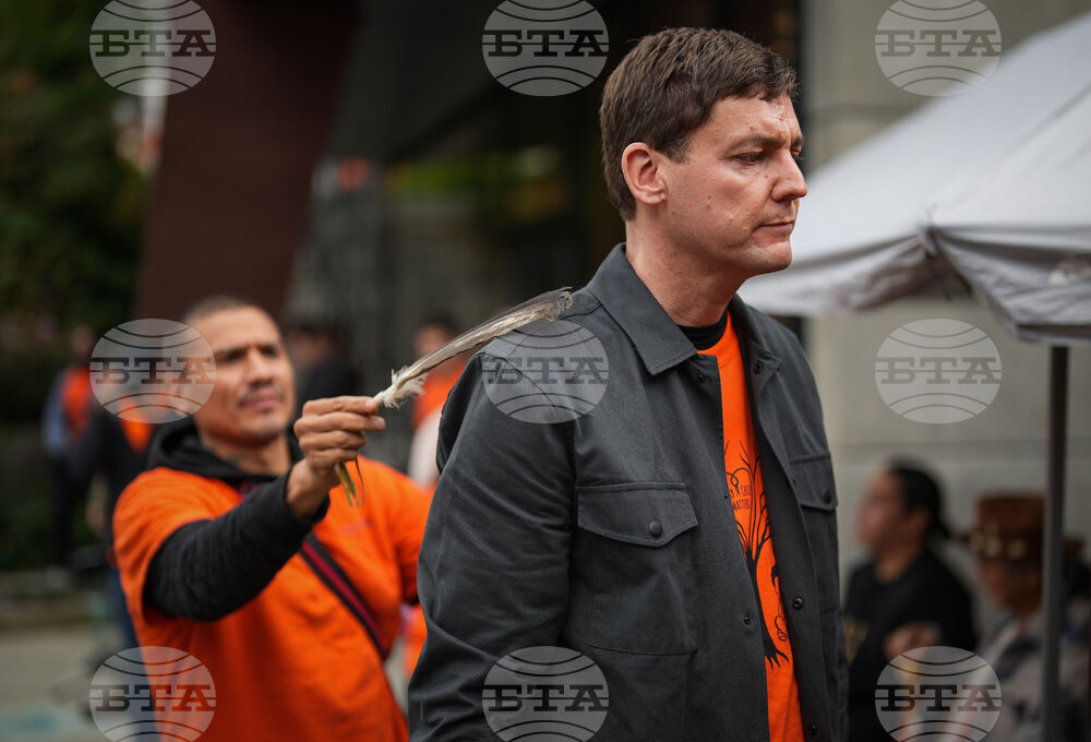 B.C. Premier David Eby is smudged with tobacco by Mitchell Tourangeau during a gathering to mark the National Day for Truth and Reconciliation at the University of British Columbia, in Vancouver, on Tuesday, September 30, 2025. (Darryl Dyck/The Canadian Press via AP)