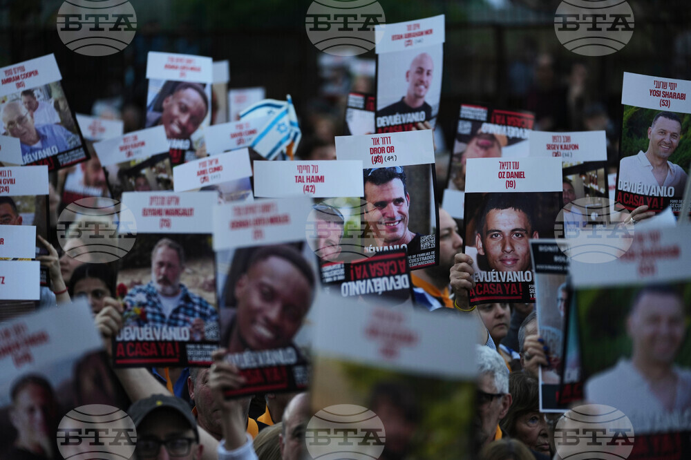 People hold up posters of hostages in Hamas captivity in Gaza, to demand their release, in Buenos Aires, Argentina, Tuesday, Sept. 30, 2025. (AP Photo/Rodrigo Abd)