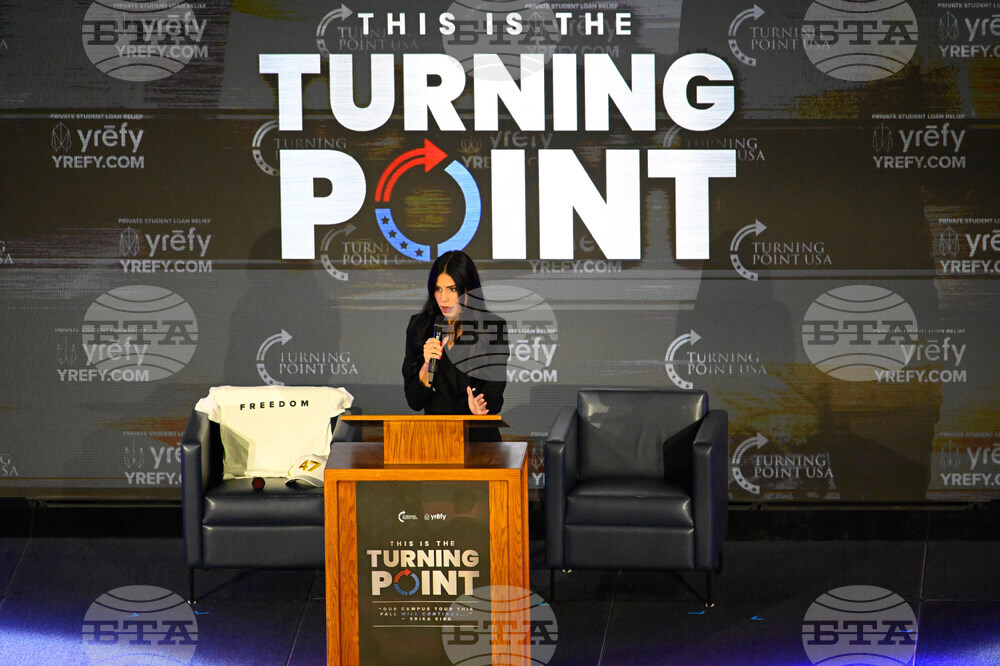 Alex Clark speaks during a Turning Point USA rally at Utah State University, as a part of the organization's push to memorialize Charlie Kirk, Tuesday, Sept. 30, 2025, in Logan, Utah. (AP Photo/Alex Goodlett)