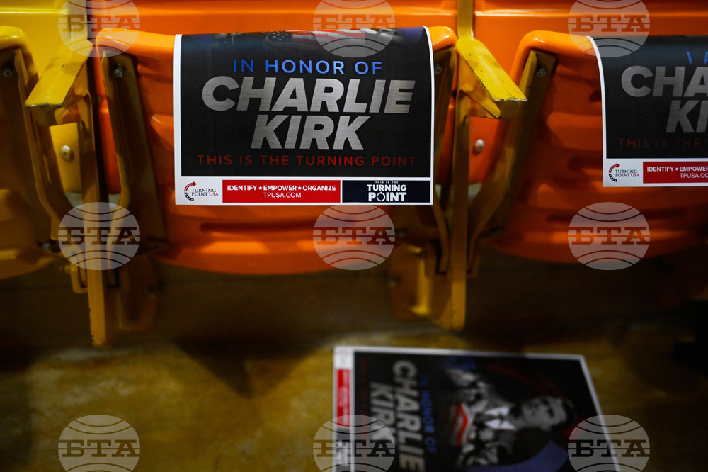 Signs for Charlie Kirk hang from seats at a Turning Point USA rally at Utah State University, as a part of the organization's push to memorialize Kirk, Tuesday, Sept. 30, 2025, in Logan, Utah. (AP Photo/Alex Goodlett)