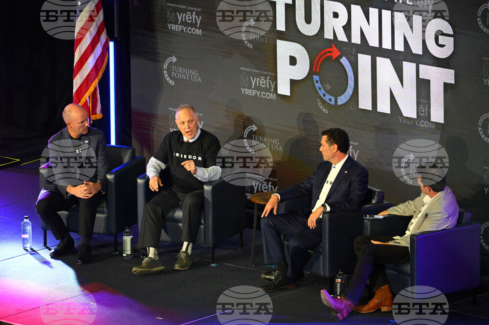 From left, Gov. Spencer Cox, Rep. Andy Biggs, former Rep. Jason Chaffetz and Turning Point's Tyler Bowyer speak on stage during a Turning Point USA rally at Utah State University, as a part of the organization's push to memorialize Charlie Kirk, Tuesday, Sept. 30, 2025, in Logan, Utah. (AP Photo/Alex Goodlett)