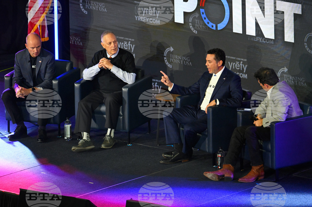 Rep. Andy Biggs, second from left, speaks as, from left, Gov. Spencer Cox, former Rep. Jason Chaffetz and Turning Point's Tyler Bowyer listen on stage during a Turning Point USA rally at Utah State University, as a part of the organization's push to memorialize Charlie Kirk, Tuesday, Sept. 30, 2025, in Logan, Utah. (AP Photo/Alex Goodlett)