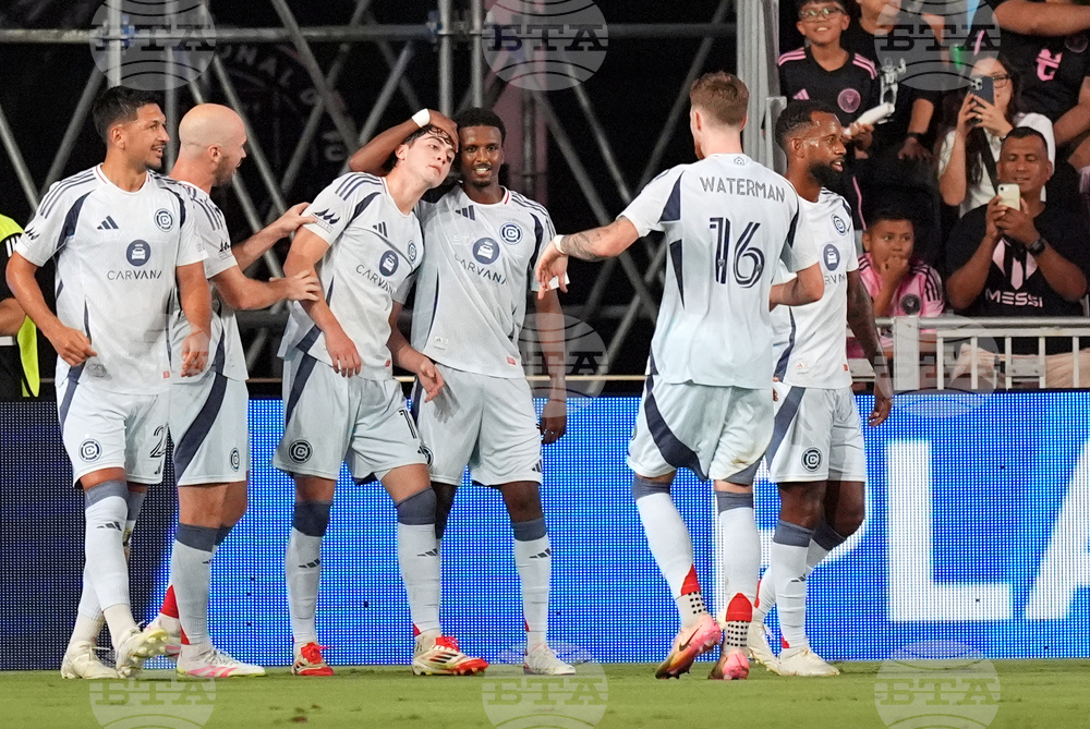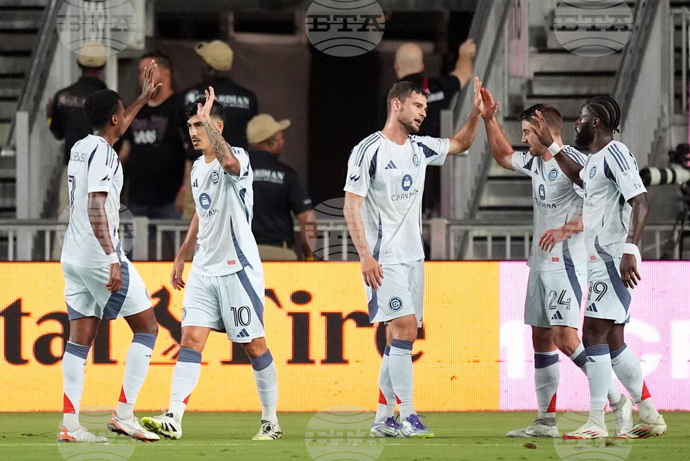 Teammates celebrate with Chicago Fire defender Jonathan Dean (24) after he scored their side's second goal against Inter Miami during the first half of an MLS soccer match, Tuesday, Sept. 30, 2025, in Fort Lauderdale, Fla. (AP Photo/Rebecca Blackwell)