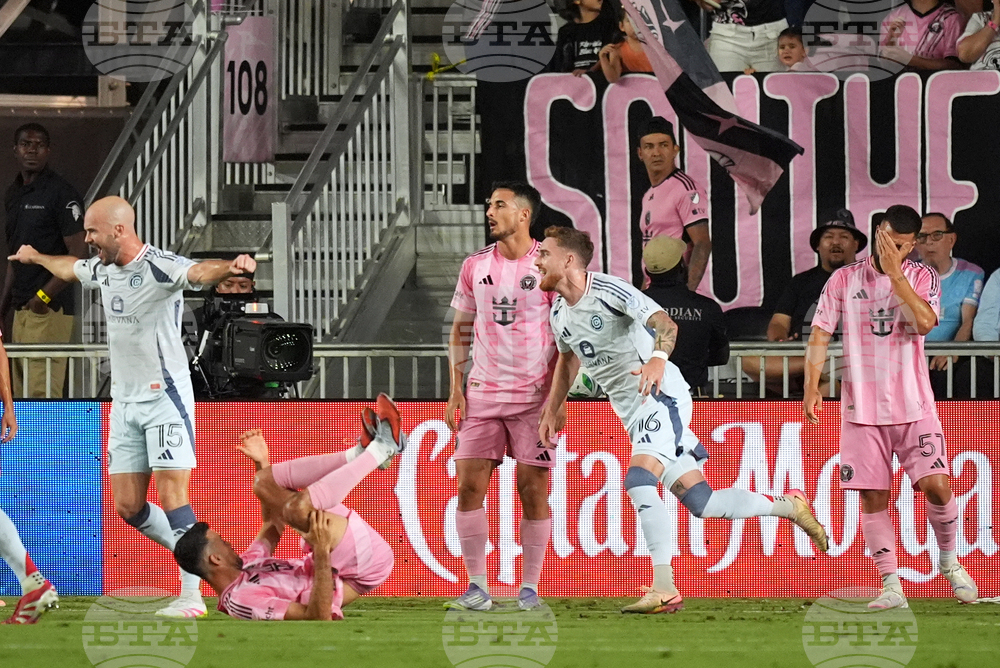 Inter Miami players react as Chicago Fire defender Andrew Gutman (15) and defender Joel Waterman (16) celebrate their side's first goal during the first half of an MLS soccer match, Tuesday, Sept. 30, 2025, in Fort Lauderdale, Fla. (AP Photo/Rebecca Blackwell)