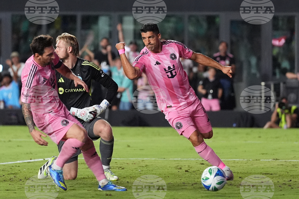 Inter Miami forward Luis Suarez, right, celebrates after scoring his side's second goal against the Chicago Fire during the second half of an MLS soccer match, Tuesday, Sept. 30, 2025, in Fort Lauderdale, Fla. (AP Photo/Rebecca Blackwell)