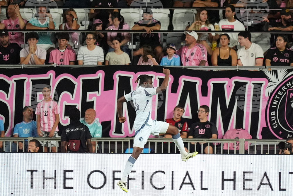 Inter Miami fans watch as Chicago Fire midfielder Rominigue Kouame (6) celebrates scoring his side's third goal during the first half of an MLS soccer match, Tuesday, Sept. 30, 2025, in Fort Lauderdale, Fla. (AP Photo/Rebecca Blackwell)