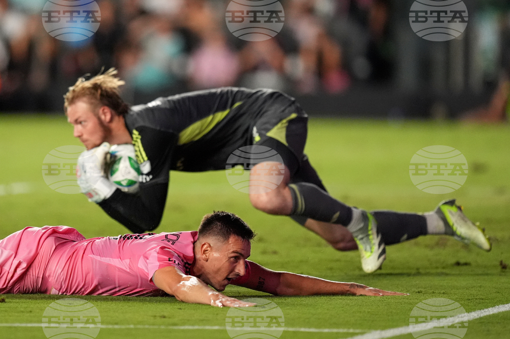 Inter Miami forward Tadeo Allende lies on the pitch as Chicago Fire goalkeeper Chris Brady stops a scoring attempt during the second half of an MLS soccer match, Tuesday, Sept. 30, 2025, in Fort Lauderdale, Fla. (AP Photo/Rebecca Blackwell)