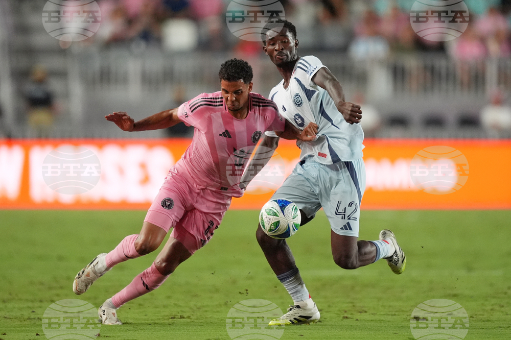 Chicago Fire midfielder Dje d'Avilla (42) prepares vies with Inter Miami defender Ian Fray for the ball during the second half of an MLS soccer match, Tuesday, Sept. 30, 2025, in Fort Lauderdale, Fla. (AP Photo/Rebecca Blackwell)