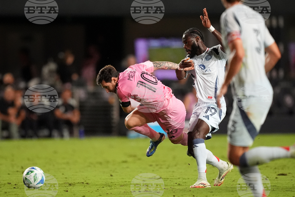 Inter Miami forward Lionel Messi (10) clashes with Chicago Fire forward Jonathan Bamba (19) during the first half of an MLS soccer match, Tuesday, Sept. 30, 2025, in Fort Lauderdale, Fla. (AP Photo/Rebecca Blackwell)