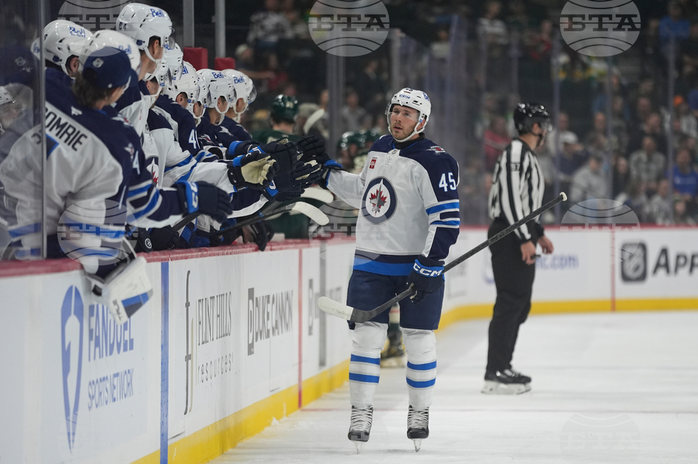 Winnipeg Jets left wing Cole Koepke (45) celebrates after scoring a goal during the first period of an NHL hockey preseason game against the Minnesota Wild, Tuesday, Sept. 30, 2025, in St. Paul, Minn. (AP Photo/Abbie Parr)