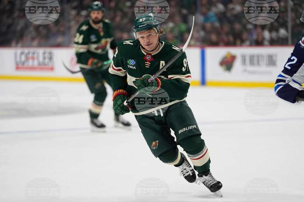 Minnesota Wild left wing Kirill Kaprizov (97) skates during the first period of an NHL hockey preseason game against the Winnipeg Jets, Tuesday, Sept. 30, 2025, in St. Paul, Minn. (AP Photo/Abbie Parr)