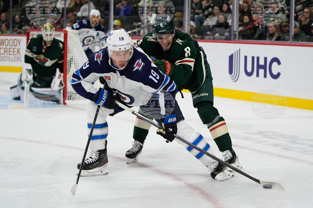 Minnesota Wild left wing Matt Boldy (12) controls the puck as Winnipeg Jets defenseman Neal Pionk (4), back, follows during the first period of an NHL hockey preseason game, Tuesday, Sept. 30, 2025, in St. Paul, Minn. (AP Photo/Abbie Parr)