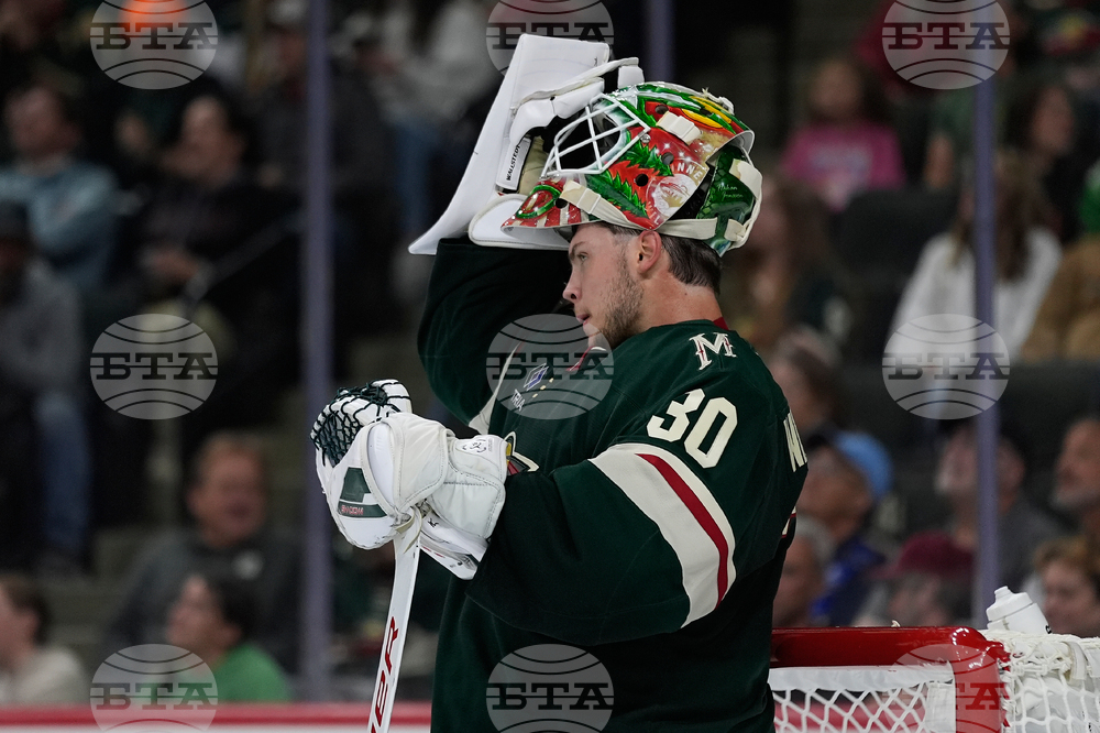 Minnesota Wild goaltender Jesper Wallstedt stands in the goal during the second period of an NHL hockey preseason game against the Winnipeg Jets, Tuesday, Sept. 30, 2025, in St. Paul, Minn. (AP Photo/Abbie Parr)