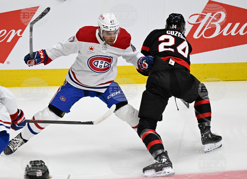 Montreal Canadiens' Jayden Struble, left, and Ottawa Senators' Dylan Cozens fight for a puck during first period NHL preseason action in Quebec City, Tuesday, Sept. 30, 2025 . (Jacques Boissinot/The Canadian Press via AP)