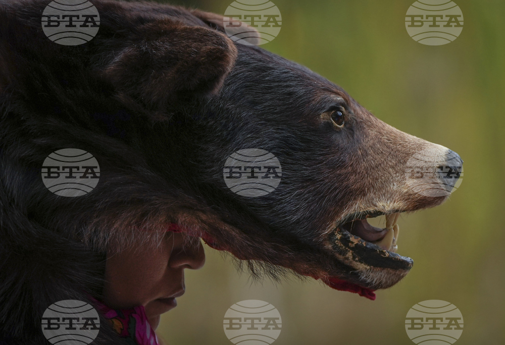 Aileen Michel (L'il Bear) wears a bear hide as she listens before performing a bear dance during a gathering to mark the National Day for Truth and Reconciliation, in Vancouver, British Columbia, Tuesday, Sept. 30, 2025. (Darryl Dyck/The Canadian Press via AP)