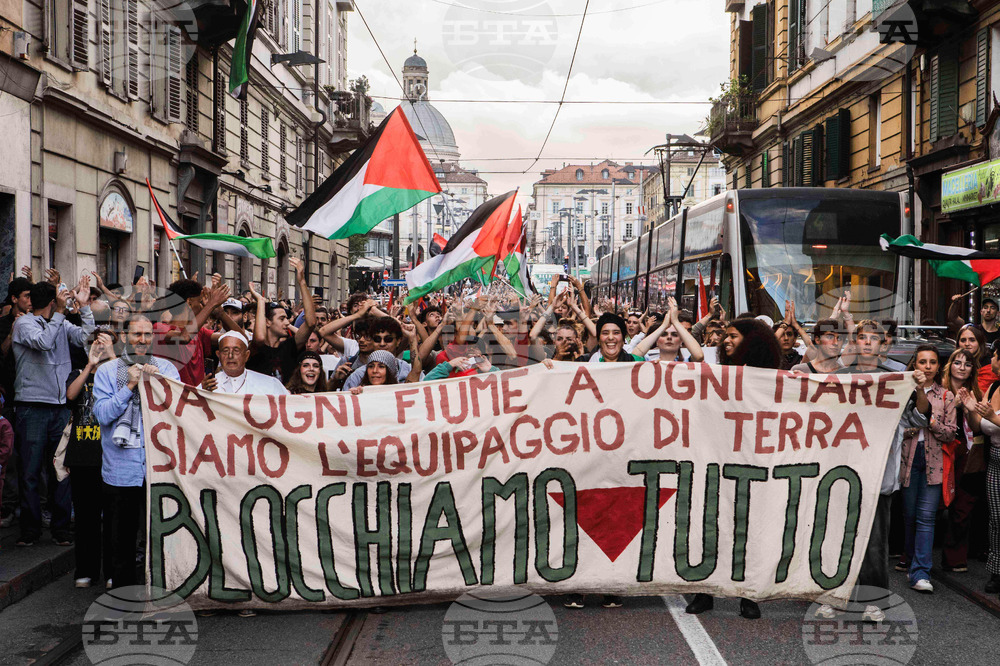 FILE - People protest during a nationwide transport, port, and school strike against the killing of Palestinians in Gaza, in Turin, Italy, on Sept. 22, 2025. (Andrea Alfano/LaPresse via AP, File)