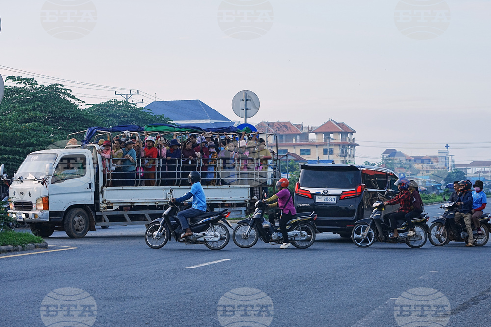 Cambodian garment workers stand in a truck while crossing a main street as they head to work in the morning, outside Phnom Penh, Cambodia, Wednesday, Oct. 1, 2025. (AP Photo/Heng Sinith)