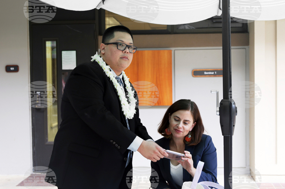 FILE -Attorney Julian Aguon, left, meets with colleague Addie Rolnick after arguing before a panel of U.S. Circuit Court of Appeals judges in Honolulu on Oct. 10, 2018. (AP Photo/Jennifer Sinco Kelleher, File)