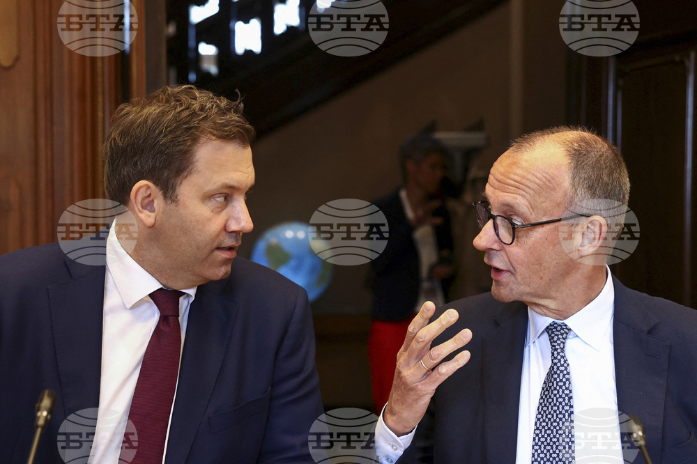 German Chancellor Friedrich Merz, right, and German Vice Chancellor and Finance Minister Lars Klingbeil attend a session of a two-day cabinet meeting at Villa Borsig in Berlin, Wednesday, Oct. 1, 2025. (Liesa Johannssen/Pool Photo via AP)