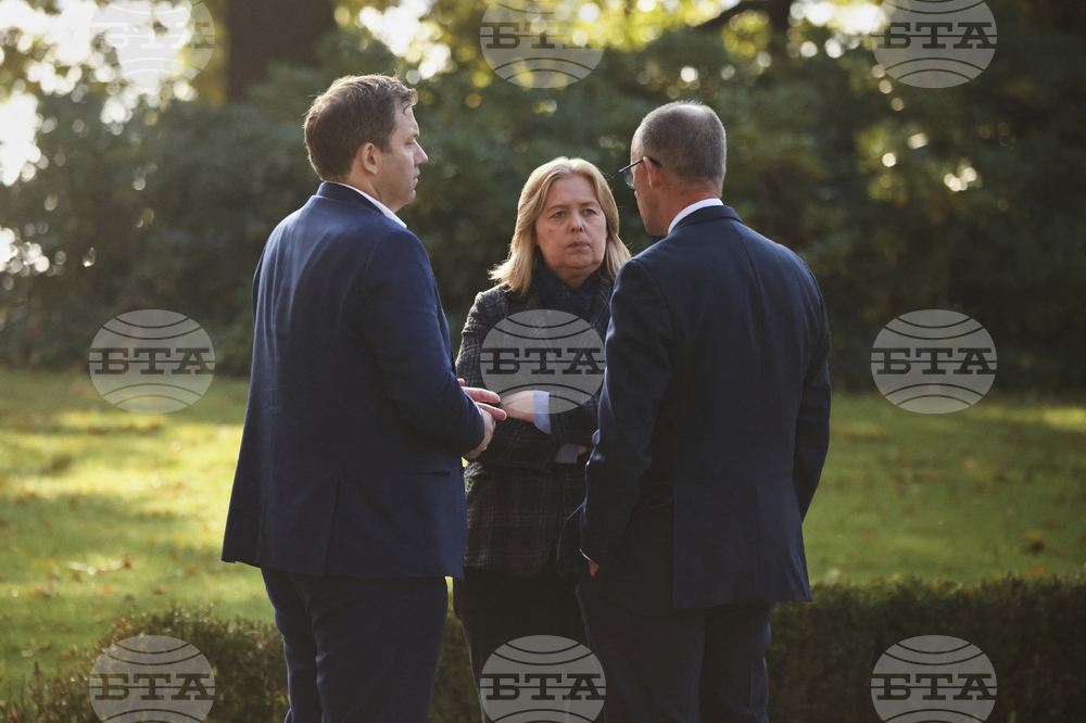 German Chancellor Friedrich Merz, right, interacts with German Vice Chancellor and Finance Minister Lars Klingbeil, left, and German Labour Minister Baerbel Bas, before a session of a two-day cabinet meeting at Villa Borsig in Berlin, Wednesday, Oct. 1, 2025. (Liesa Johannssen/Pool Photo via AP)