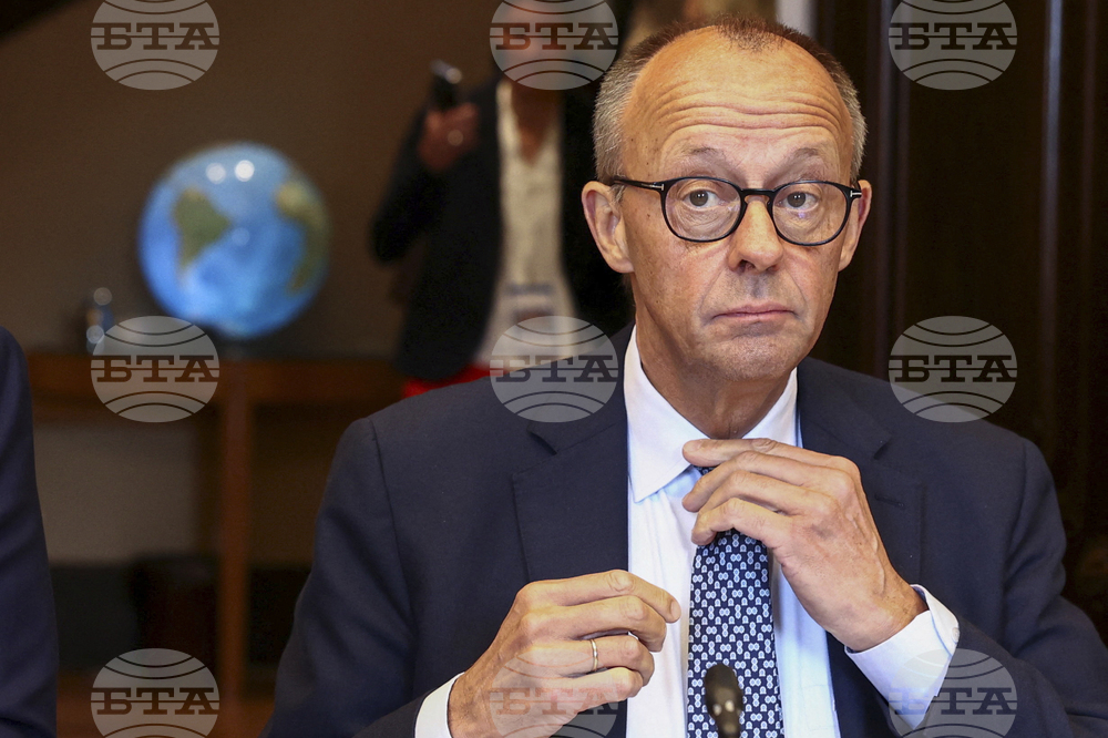 German Chancellor Friedrich Merz adjusts his tie during a session of a two-day cabinet meeting at Villa Borsig in Berlin, Wednesday, Oct. 1, 2025. (Liesa Johannssen/Pool Photo via AP)