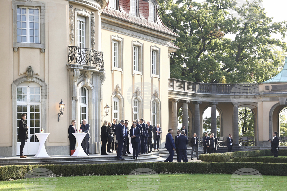 Members of the German cabinet gather outside the venue before a session of a two-day cabinet meeting at Villa Borsig in Berlin, Wednesday, Oct. 1, 2025. (Liesa Johannssen/Pool Photo via AP)