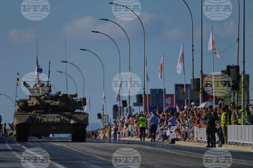 Cyprus' soldiers on armored vehicles take part in a military parade marking the 65th anniversary of Cyprus' independence from British colonial rule, in capital Nicosia, Cyprus, Wednesday, Oct. 1, 2025. (AP Photo/Petros Karadjias)