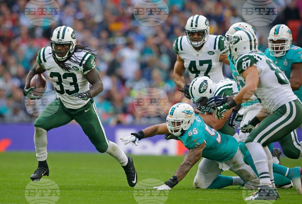 FILE - New York Jets' Chris Ivory, left, runs with the ball during the NFL football game between the New York Jets and the Miami Dolphins and at Wembley stadium in London, Oct. 4, 2015. (AP Photo/Matt Dunham, file)