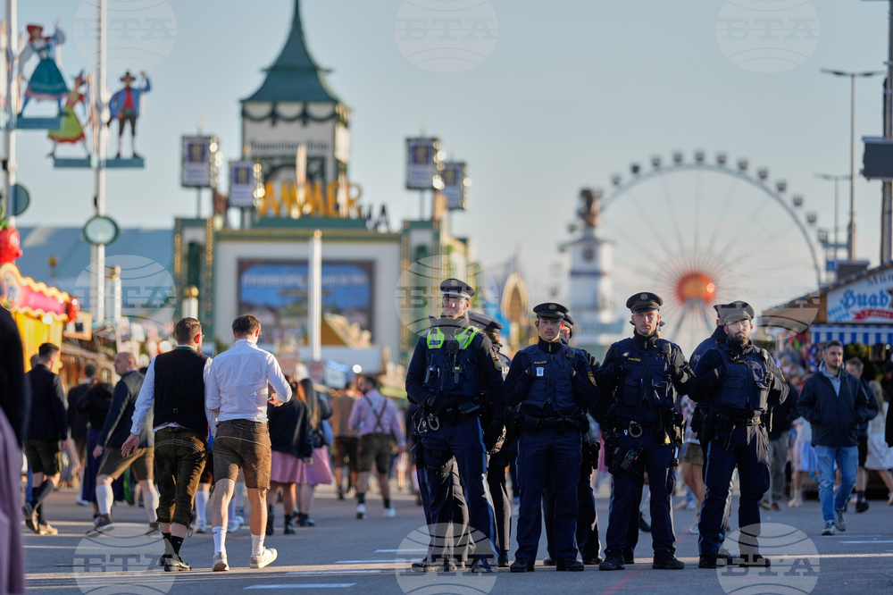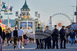Visitors walk to the re-opening of the Oktoberfest watched by police officers that was closed since the morning after a bomb threatening in Munich, Germany, Wednesday, Oct.1, 2025. (AP Photo/Matthias Schrader)