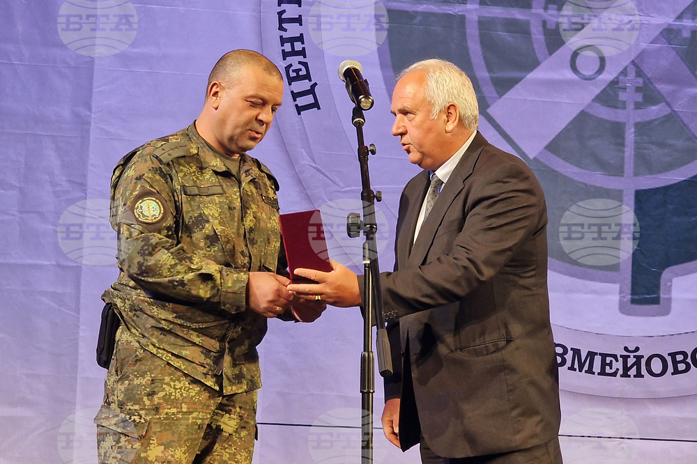 Стара Загора (1 октомври 2025) В Стара Загора се отбелязва 55 години от създаването на Централен артилерийски технически изпитателен полигон (ЦАТИП). На снимката: началникът на политическия кабинет на министъра на отбраната Николай Доцев (вляво) награждава старшина Николай Лещов.