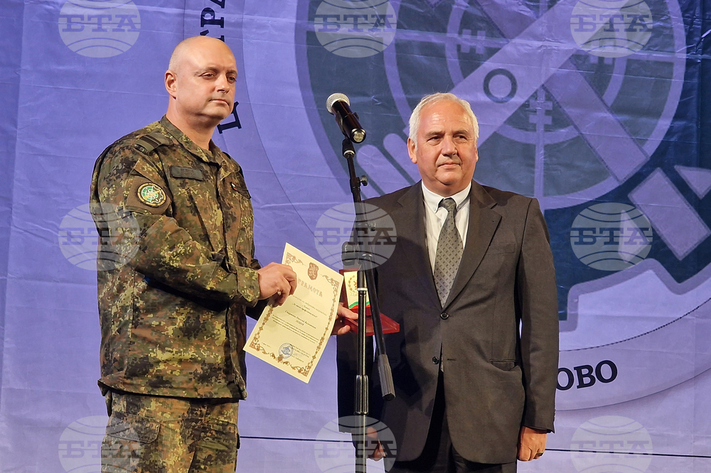Стара Загора (1 октомври 2025) В Стара Загора се отбелязва 55 години от създаването на Централен артилерийски технически изпитателен полигон (ЦАТИП). На снимката: началникът на политическия кабинет на министъра на отбраната Николай Доцев (вляво) награждава капитан Веселин Томов.