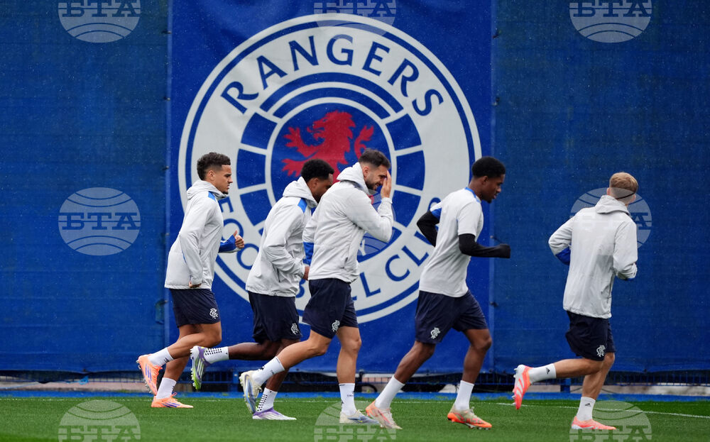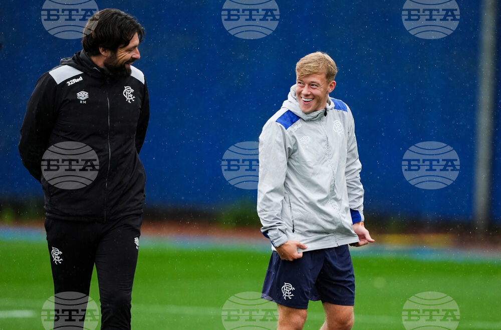 Rangers players during a training session at Rangers Training Centre, Glasgow, Scotland, Wednesday, Oct. 1, 2025. (Andrew Milligan/PA via AP)
