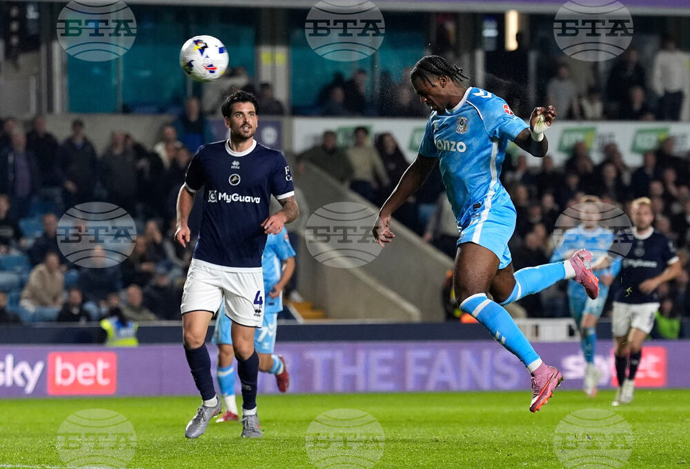 Coventry City's Haji Wright, right,scores their side's second goal of the game during a Sky Bet Championship soccer match against Millwall, Wednesday, Oct. 2, 2025, at The Den in London, England. (Andrew Matthews/PA via AP)
