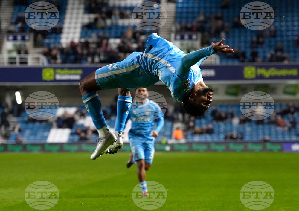 Coventry City's Haji Wright celebrates after scoring his second goal of the game during a Sky Bet Championship soccer match against Millwall, Wednesday, Oct. 2, 2025, at The Den in London, England. (Andrew Matthews/PA via AP)