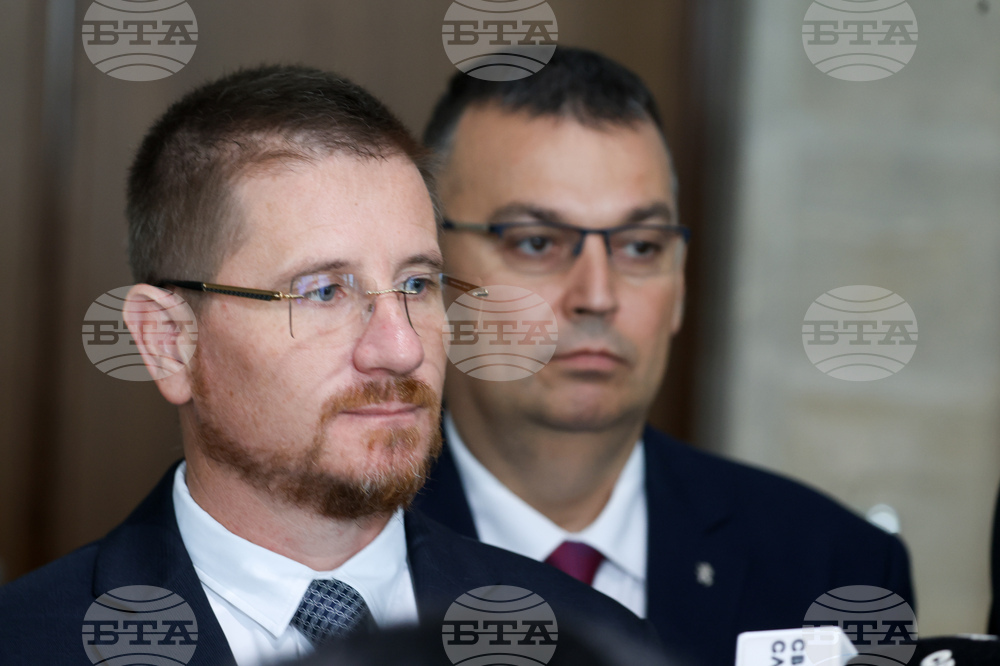 София (1 октомври 2025) Депутати от „Възраждане“ дават изявление за медиите в кулоарите на Народното събрание. На снимката: народните представители - Димо Дренчев и Емил Янков.