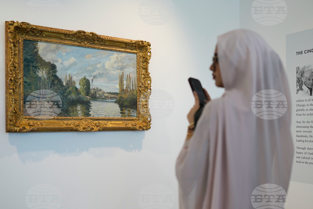A visitor looks at a 1872 painting by Camille Pissarro titled 'Bords de l'Oise, près de Pontoise, temps gris" (The Banks of the Oise near Pontoise, grey weather), during a pre-auction exhibition in Abu Dhabi, United Arab Emirates, Wednesday, Oct. 1, 2025. These paintings by Vincent Van Gogh, Paul Gauguin, Frida Kahlo, Edvard Munch, Rene Magritte and Camille Pissaro are expected to sell for U.S. $1.5 million at an auction in New York in November 2025. (AP Photo/Altaf Qadri)