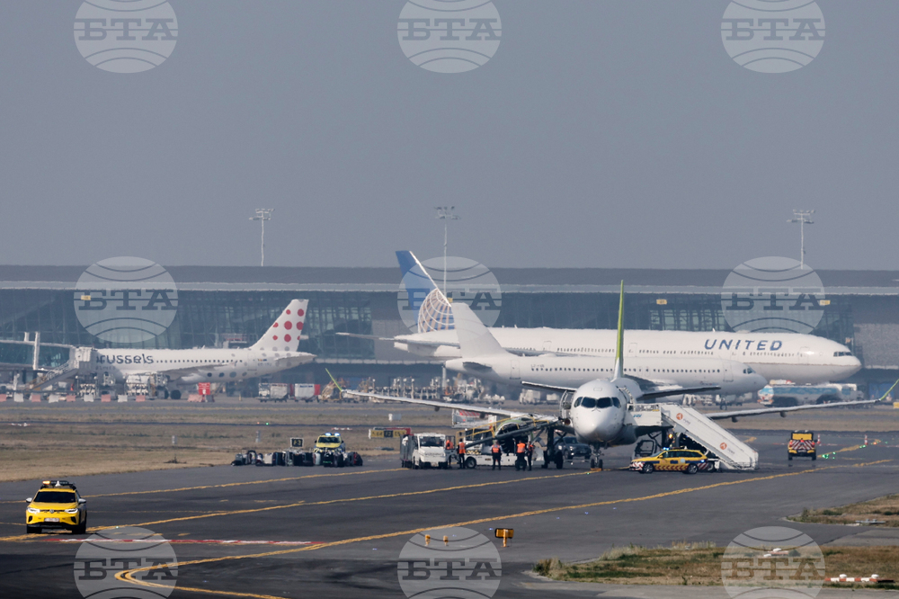 Security personnel search an aircraft on the tarmac after a bomb threat at Brussels International Airport in Zaventem, Belgium, Wednesday, Oct. 1, 2025. (AP Photo/Geert Vanden Wijngaert)