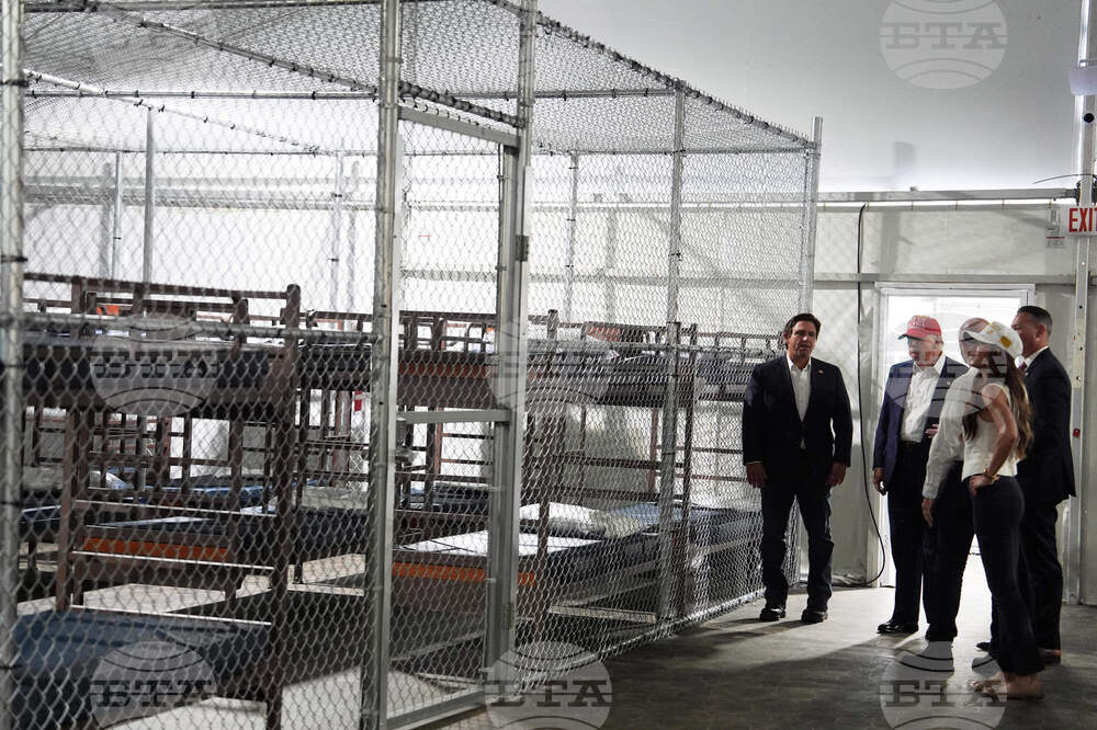 FILE - President Donald Trump, Gov. Ron DeSantis, R-Fla., and Homeland Security Secretary Kristi Noem, and others, tour "Alligator Alcatraz," a new migrant detention facility at Dade-Collier Training and Transition facility, Tuesday, July 1, 2025, in Ochopee, Fla. (AP Photo/Evan Vucci, File)