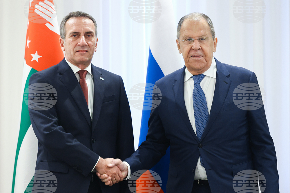 In this photo released by Russian Foreign Ministry Press Service on Wednesday, Oct. 1, 2025, Russian Foreign Minister Sergey Lavrov, right, and Foreign Minister of Georgia's breakaway region of Abkhazia Oleg Bartsits pose for a photo during their meeting in Sochi, Russia. (Russian Foreign Ministry Press Service via AP)