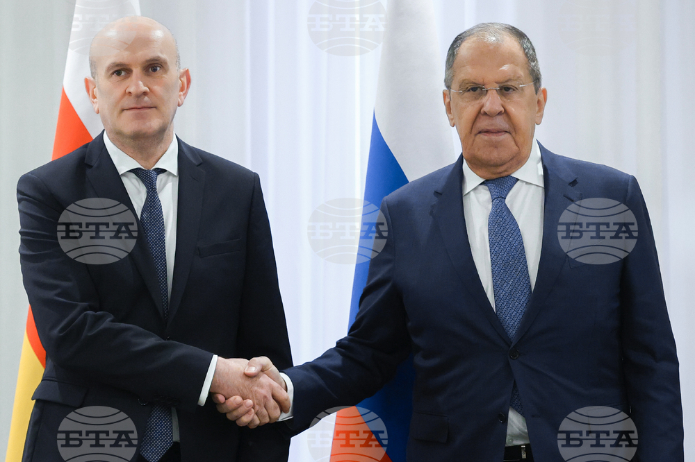 In this photo released by Russian Foreign Ministry Press Service on Wednesday, Oct. 1, 2025, Russian Foreign Minister Sergey Lavrov, right, and Foreign Minister of Georgia's breakaway region of South Ossetia Akhsar Dzhioev pose for a photo during their meeting in Sochi, Russia. (Russian Foreign Ministry Press Service via AP)