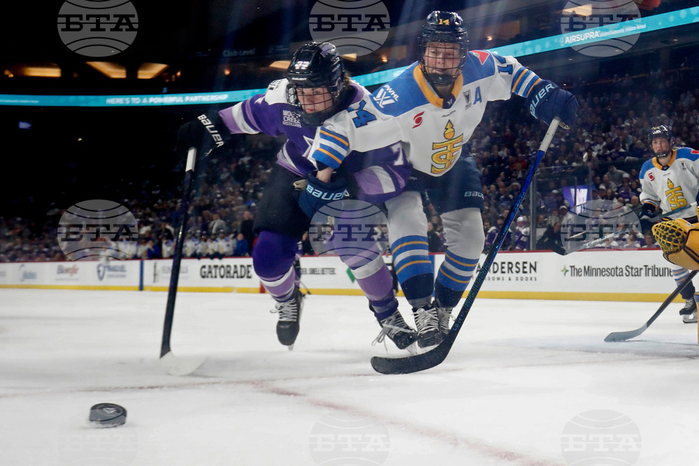 FILE - Minnesota Frost forward Britta Curl-Salemme (77) vies for the puck with Toronto Sceptres forward Natalie Spooner (24) in the second period of a PWHL hockey playoff game May 11, 2025, in St. Paul, Minn. (AP Photo/Bruce Kluckhohn, File)