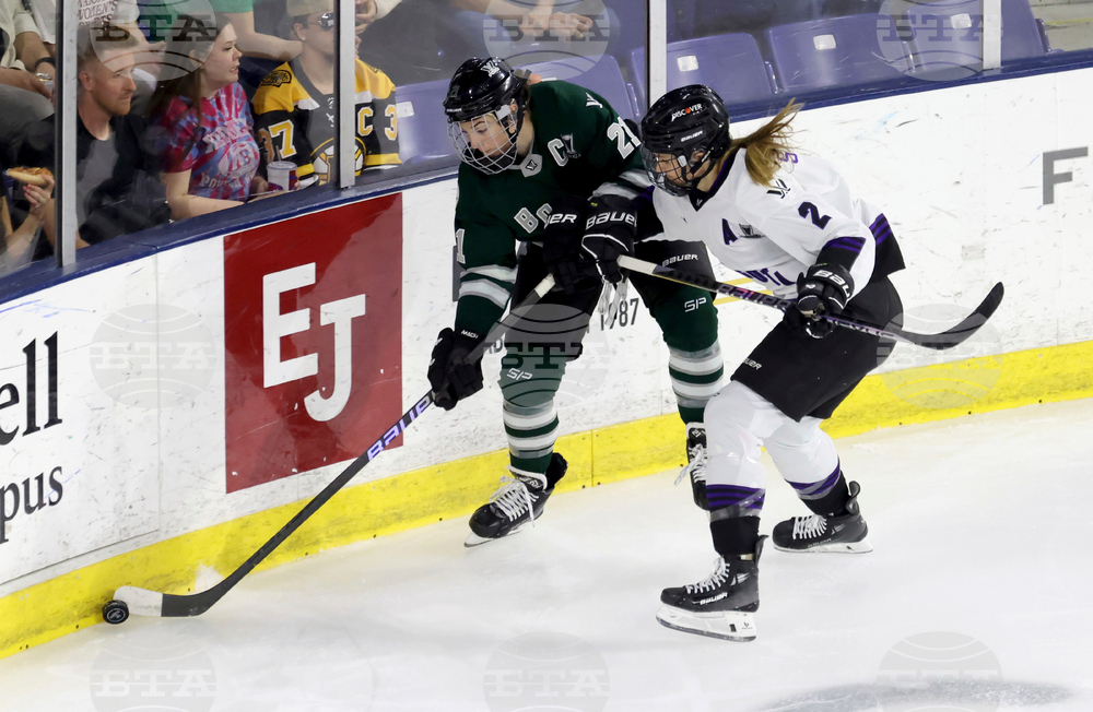 FILE - Boston forward Hilary Knight (21) and Minnesota defender Lee Stecklein (2) chase the puck against the boards during the first period of Game 2 of a PWHL hockey championship series, May 21, 2024, in Lowell, Mass. (AP Photo/Mark Stockwell, File)