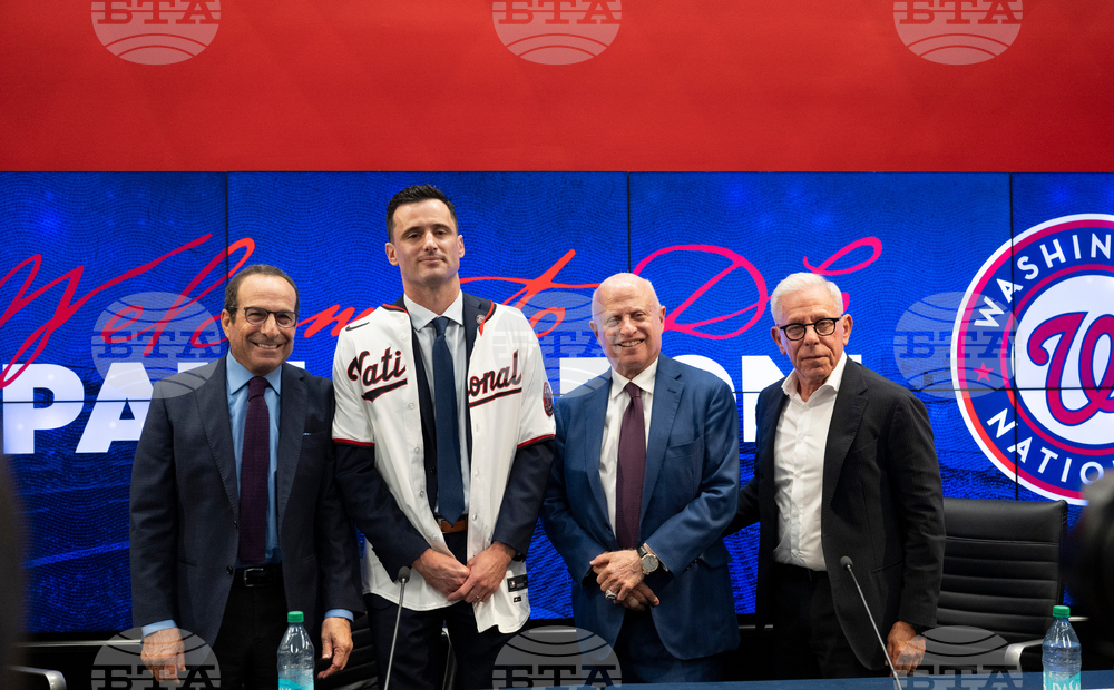 Washington Nationals new president of baseball operations Paul Toboni, second from left, poses with club owners Robert Tanenbaum, left, Mark Lerner, center right, and Edward Cohen, right, during a news conference at Nationals Park in Washington, Wednesday, Oct. 1, 2025. (Marvin Joseph/The Washington Post via AP)