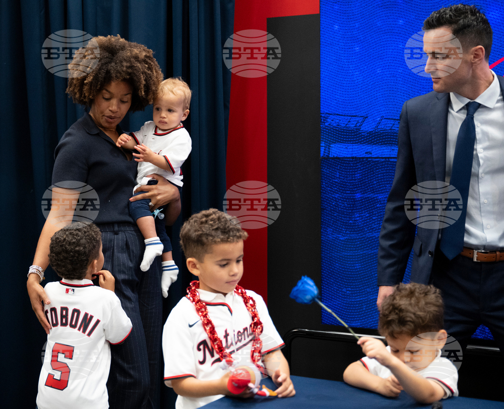 Paul Toboni, right, the Washington Nationals' new president of baseball operations, looks at his wife Danielle Toboni and their four sons after he was introduced during news conference at Nationals Park in Washington, Wednesday, Oct. 1, 2025. (Marvin Joseph/The Washington Post via AP)