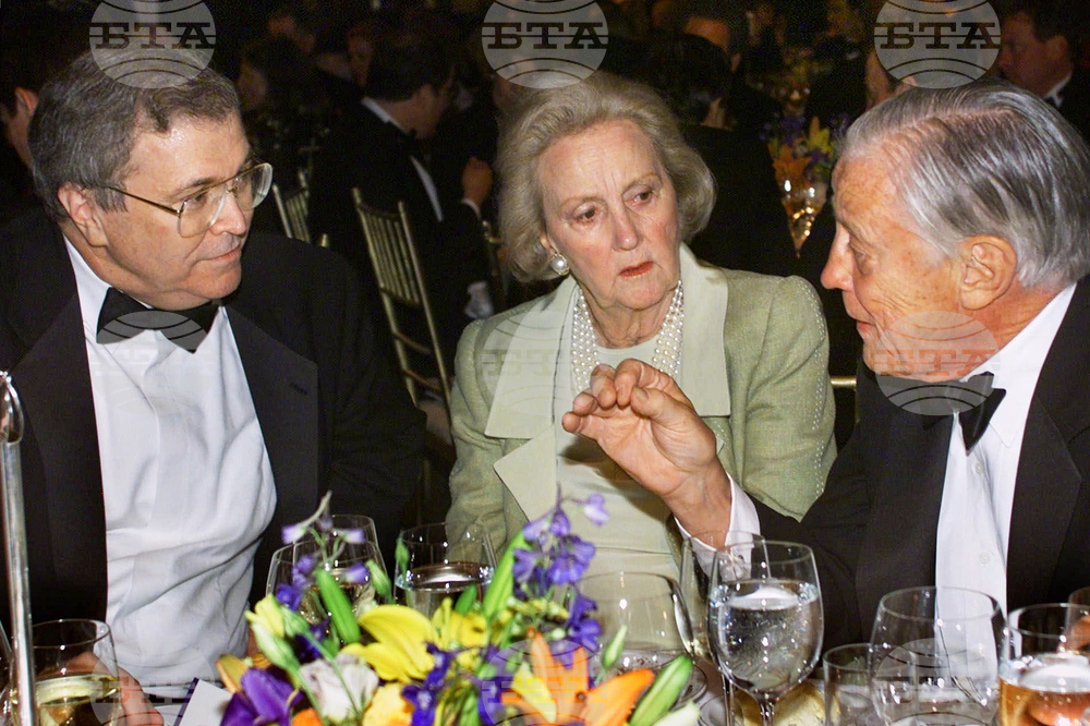 FILE - CNN Chairman and CEO Tom Johnson, left, is joined by retired Washington Post Executive Editor Ben Bradlee, right, and Chair of the Washington Post Company Katharine Graham, center, at a Reporters Committee for Freedom of the Press dinner in New York on May 22, 2001. (AP Photo/J. Scott Applewhite, File)