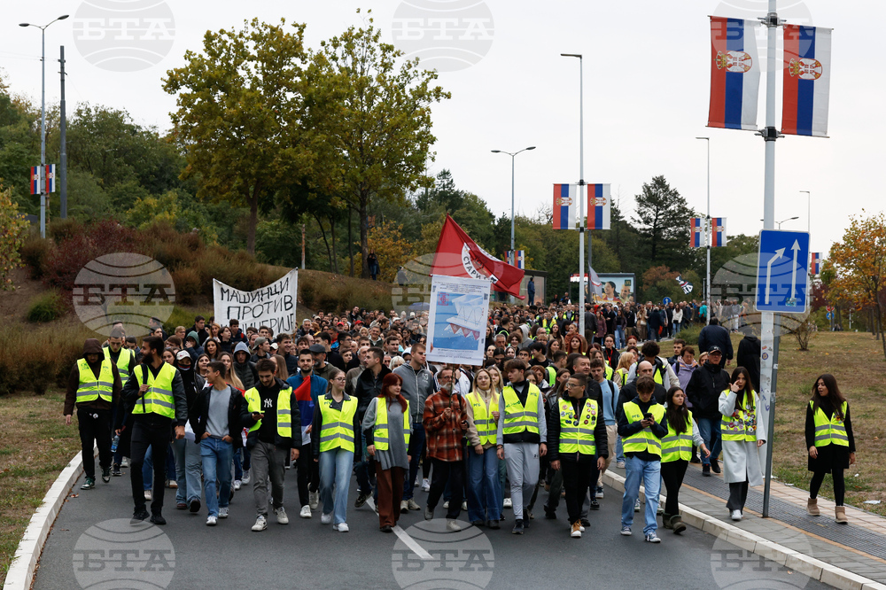 People march during a protest in Belgrade, Serbia, Wednesday, Oct. 1, 2025, eleven months after the deadly train station tragedy that sparked mass demonstrations against corruption. (AP Photo/Marko Drobnjakovic)