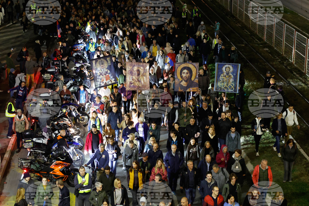 People march during a protest eleven months after the deadly train station tragedy that sparked mass demonstrations against corruption in Belgrade, Serbia, Wednesday, Oct. 1, 2025. (AP Photo/Marko Drobnjakovic)