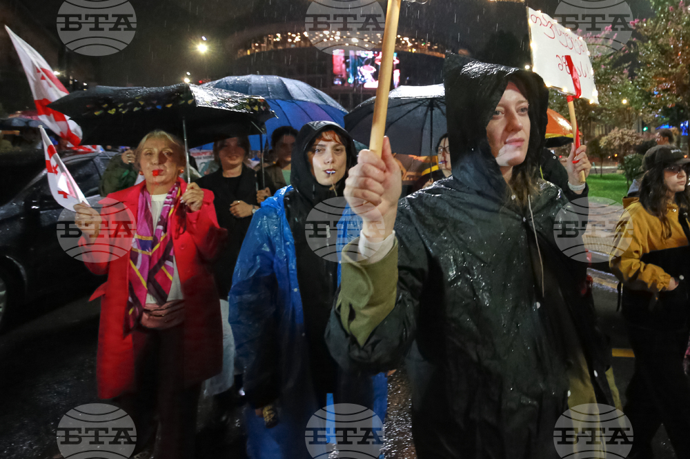 Protesters gather in the city center of Tbilisi, Georgia, Wednesday, Oct. 1, 2025 to denounce Georgian government's anti European stance and call for the release of prisoners detained as part of a crackdown on political opponents. (AP Photo/Zurab Tsertsvadze)