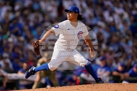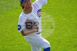 Chicago Cubs' Shota Imanaga warms up before Game 2 of a National League wild card baseball game against the San Diego Padres Wednesday, Oct. 1, 2025, in Chicago. (AP Photo/Nam Huh)