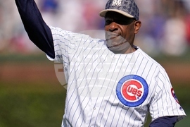 Andre Dawson throws a ceremonial first pitch before Game 2 of a National League wild card baseball game Wednesday, Oct. 1, 2025, in Chicago. (AP Photo/Erin Hooley)